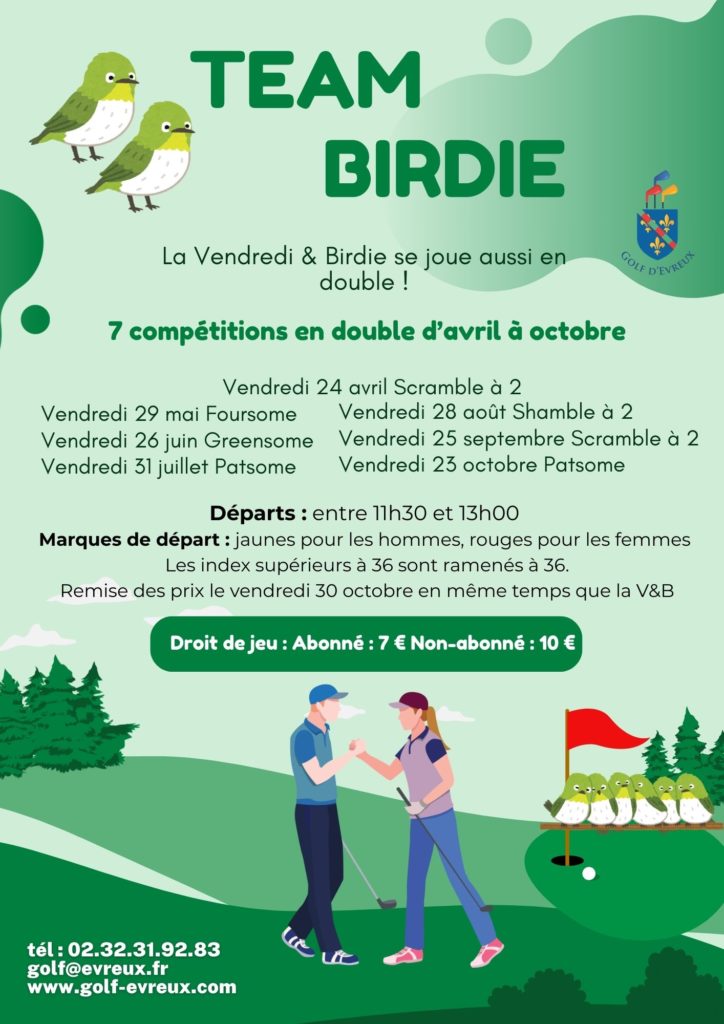 La Team’Birdie est un challenge annuel en équipe de 2, organisé entre le 27 avril et le 26 octobre 2026.