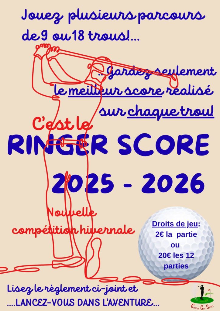 Le Ringer Score retient le meilleur score de chaque trou réalisé lors des différentes parties amicales réalisées sur 9 trous minimum sur la période du lundi 8 décembre 2025 au jeudi 2 avril 2026 inclus.